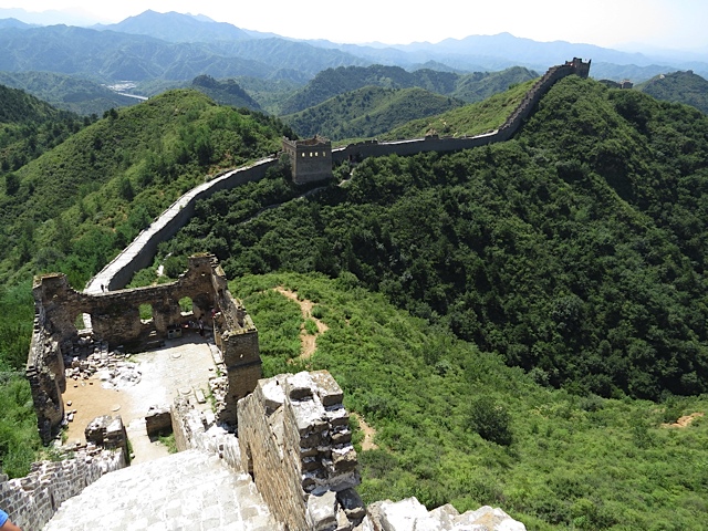 Desde abajo, la muralla es todavía un hilillo que zigzaguea, nervioso, sobre las cumbres. Va dibujando el perfil de un paisaje de montañas ondulantes, espesos bosques y pastizales coloreados de un verde intenso. Las escamas de esta fascinante serpiente milenaria son las almenas, recortadas sobre un cielo azul que deslumbra, porque en estos parajes el verdadero enemigo no son los mongoles ni los manchúes, sino un sol implacable que nos golpea en la cabeza.