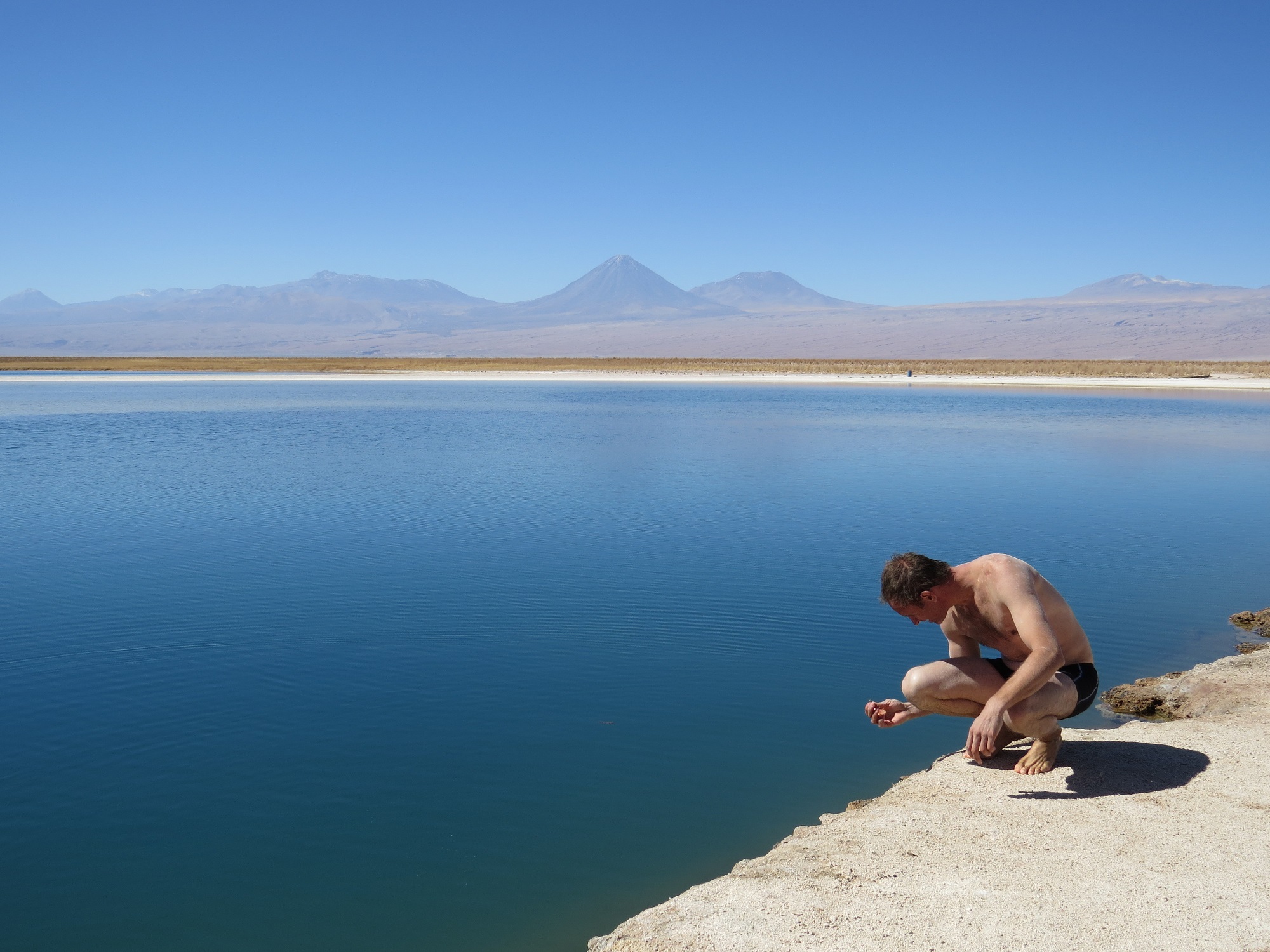 Cuando vimos que la pista llena de baches nos adentraba en una llanura blancuzca, sin vegetación alguna, dedujimos que habíamos llegado a nuestro destino. Sin embargo, no había sitio para detenernos. El camino nos hacía pasar por el centro del salar de Atacama, y nosotros mirábamos a derecha e izquierda, esperando ver algún ensanchamiento de la pista para hacer una foto; algún rótulo o alma humana que nos regalase alguna explicación. Finalmente, nos dimos por vencidos. Paramos en mitad de la pobre carretera, bajo los únicos carteles que había en kilometros a la redonda, que sólo decían: “peligro de hundimiento”. Esta advertencia no era baladí: el salar esconde bajo su superficie una gran laguna. De vez en cuando, cuando la naturaleza lo decide, la superficie blanca rocosa se abre y el agua sale a flote, formando lagunillas saladas que atrae a las aves del lugar. Por la mañana habíamos estado en dos de ellas: la Laguna Cejar y la Laguna Piedra, donde pusimos a prueba las leyes de la física: sí, en ellas, como en el Mar Muerto, se puede flotar.